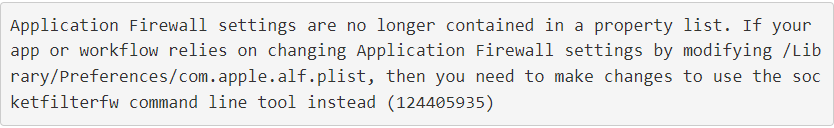 Google also points to this change as causing issues in a recent Chromium bug report, where they say they need to change how Google Chrome detects Mac firewall settings to use 'socketfilterfw' instead.