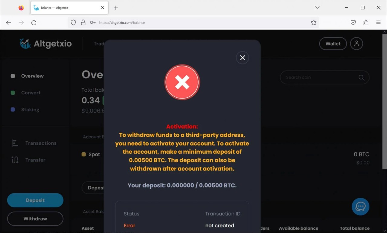 However, when attempting to withdraw the free Bitcoins, you must first activate your account by depositing .005 Bitcoins, worth approximately $132. As you will never receive any bitcoins from the site, the scammers generate their revenue by stealing these "activation" deposits.